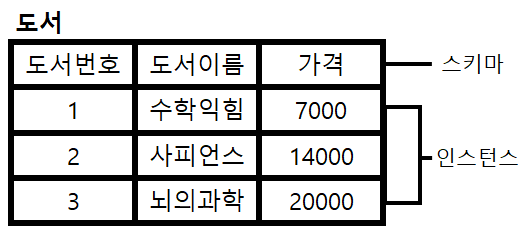 -인스턴스(instance): 스키마에 들어가는 값들(저장된 전체 데이터)